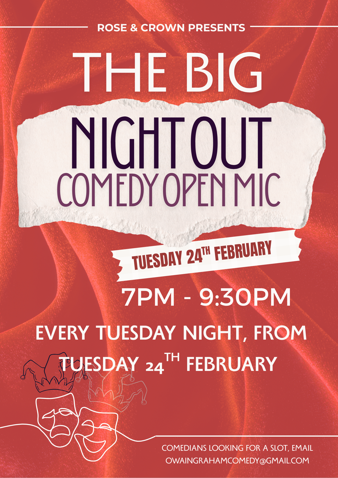Comedy is coming to The Roser! Join us for The Big Night Out, a brand-new comedy open mic launching on Tuesday 24th February, and running every Tuesday night thereafter.